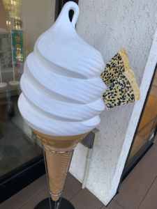 ここでいただく、ソフトクリームにせんべいをディップして食べる