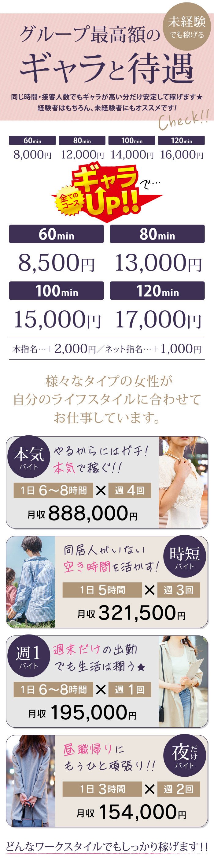 全額現金日払い制 イッツブーリー 一切受け身なし!責められる事無し! 40分6,000円~8,000円 50分7,000円~9,000円 60分8,000円~10,000円 70分9,000円~11,000円 本指名2000円 NET指名1000円 ナース・女医治療院 「指入れなし」18歳~35歳のお姉さん系ヘルス 40分5,000円~7,000円 50分6,000円~8,000円 60分7,000円~9,000円 70分8,000円~10,000円 本指名2000円 NET指名1000円 あつまれミルクの島 道内唯一の専門店。母乳・妊婦さん大歓迎! ■妊婦ママコース 45分6,500円~8,500円 60分9,000円~11,000円 ■母乳ママコース 60分8,000円~10,000円 70分9,000円~11,000円 本指名2000円 NET指名1000円 上記以上のコースは全店組み合わせになります。 例60分×2で120分 指名バック2000円×2 給与シミュレーションはこちら |