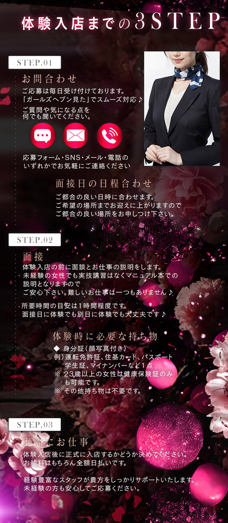当店は特別な容姿やテクニックは必要ございません。年齢や容姿より女性としての優しさや心のキレイさ,女性らしさ、やる気などを重視としております。