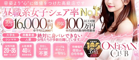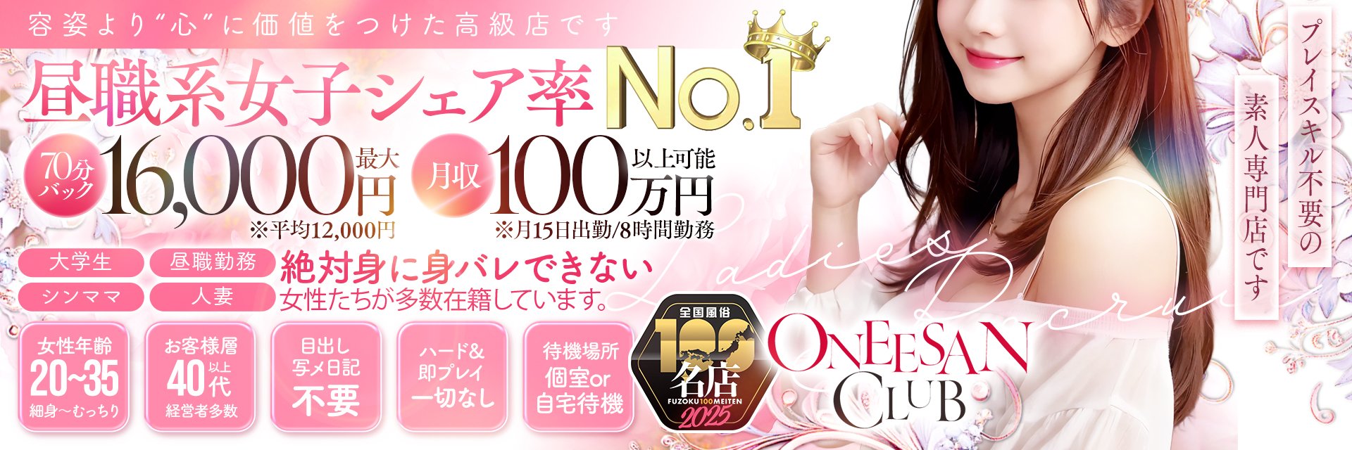 「お姉さんCLUB」は従来の風俗業界の2大ジャンルである「18歳~20歳くらいが多い若いコのお店」・「30代以上の人妻店」の隙間の新たな第3ジャンルとして確立する「素人×お姉さん専門」のデリヘル店です。