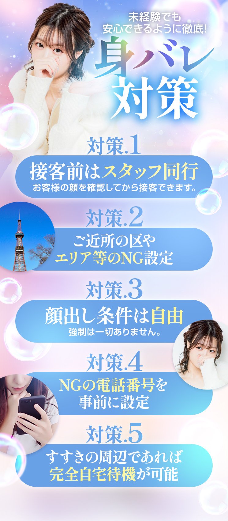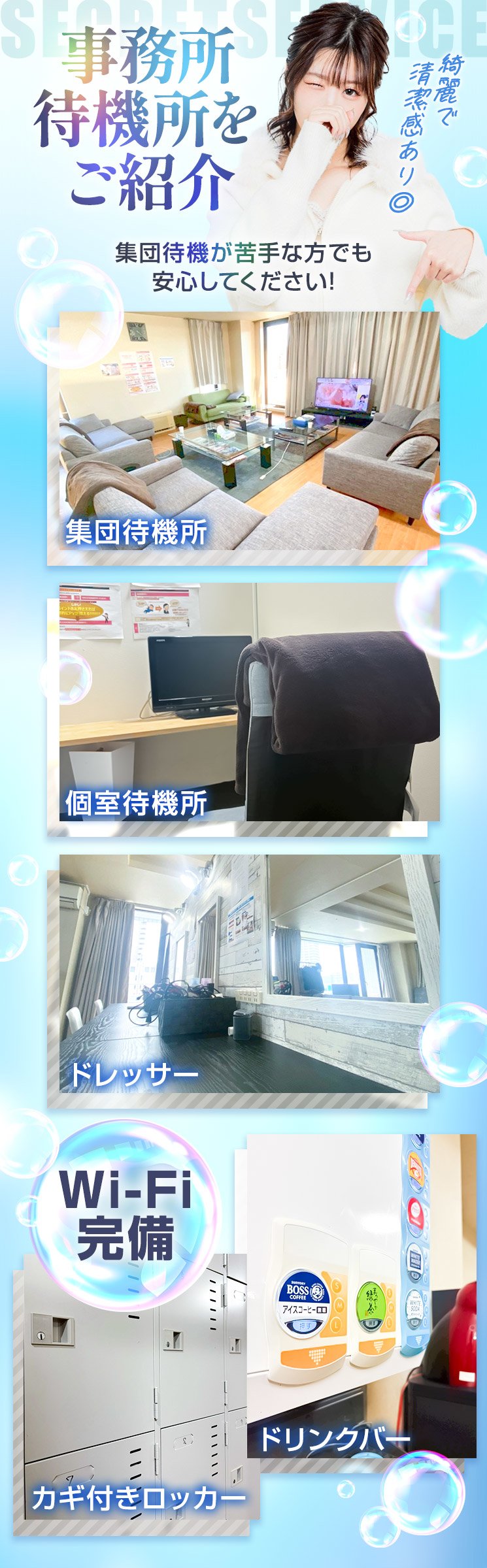 風俗の事が全く分からない未経験の方は、特にこの業界に対し怖いイメージなどがあるかもしれません。当店はそのイメージを払拭し女性に働きやすい空間を提供させていただきます。