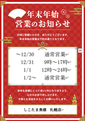 本日はお知らせということで、年末年始の営業に関してです!