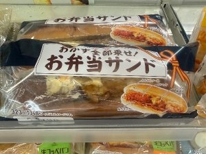 コッペパンの中に焼きそば、コロッケ、磯辺揚げが入っているお弁当サンド!!