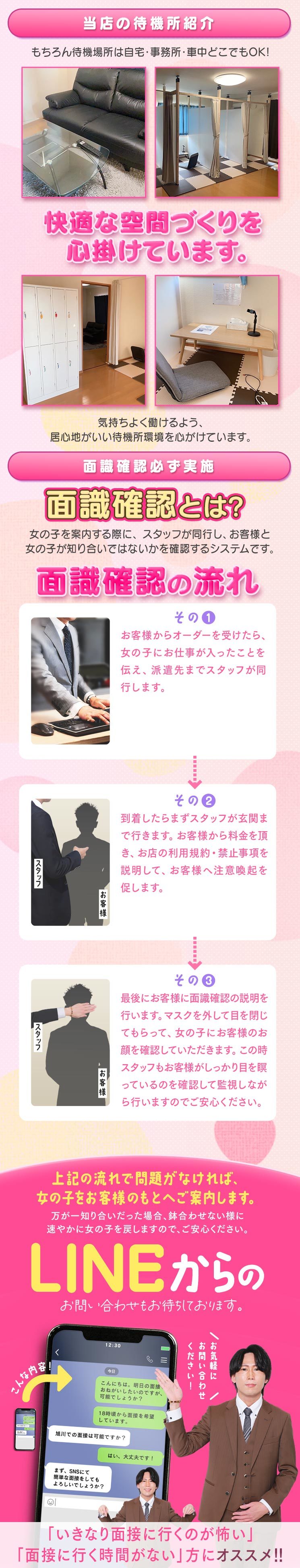 A | 当店で行っている身バレ対策は下記になります。 ・面通し ・在籍写真、写メ日記での顔出し強制一切なし ・派遣場所のNG設定 ※面通し お客様のもとへ女の子を派遣する際に、スタッフ同行のもとお客様と女の子が知り合いではないかの確認します。 お客様は目を閉じていただき、その間に女の子お客様の顔確認をします。 |