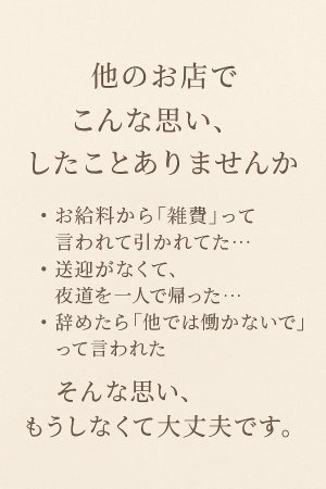 当店も人気店の仲間入りをして、人数の足りなさに大変困っており多々、オーダーをお断りすることがあるため”緊急大募集”です!!『女性を第一』に考え最も稼ぎやすい環境を生み出す努力を惜しみません。【働きやすい環境】と【安定した高収入】をお約束します☆やさしい&たのしいスタッフしかいないのでお気軽にどんなことでも相談してくださいね♪