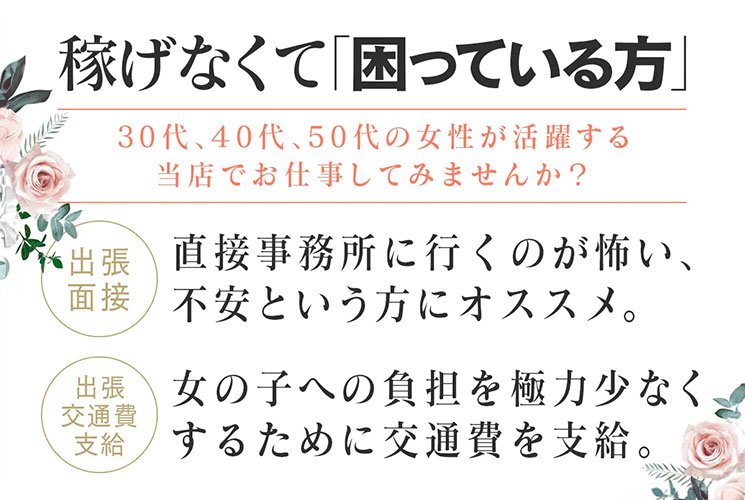 当店は30代、40代、50代と幅広く募集しております。もちろん、それ以外の年齢だとしても、まずは面接にお越しください。当店は多くの女性キャストがお仕事をし、多くのお客様にご利用いただいておりますので、稼げる環境は整えております。