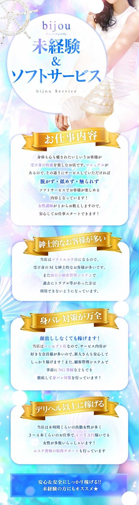 A | 当店の採用基準で最も大切にしていることは『やる気』です。お店は最大限キャスト様が働きやすい、稼ぎやすい環境でお仕事していただくよう努力させていただきます!頑張る気持ちは必ずお客様に伝わります。お客様はキャスト様が頑張って接客していただけたら必ずお店に返ってきてくれます。そうやってbijouにかかわるすべての方たちが幸せになれる。そんなお店にしていきいたいと思っております。 |
