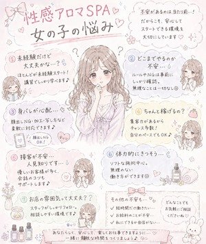 当店のHPをご覧頂きありがとうございます。当店は風俗でありながらに「舐めない、脱がない、触られない」のサービスで、ヘルス店のフ●ラや、ソープ店の本●行為のようなハードプレイは一切しないソフトプレイのお店です。性病にリスクも無く、身体を酷使することもありません。無理せずとも高収入を得ることが出来ます。未経験の子は「エステ」と聞くと難しそうと思われがちですが、当店では常駐の女性講師がマニュアルに沿って指導しますので誰でも簡単にお仕事を始めることが出来ます。迷っている方は電話やメールだけでも構いません。スタッフ一同あなたの一歩をお待ちしております。