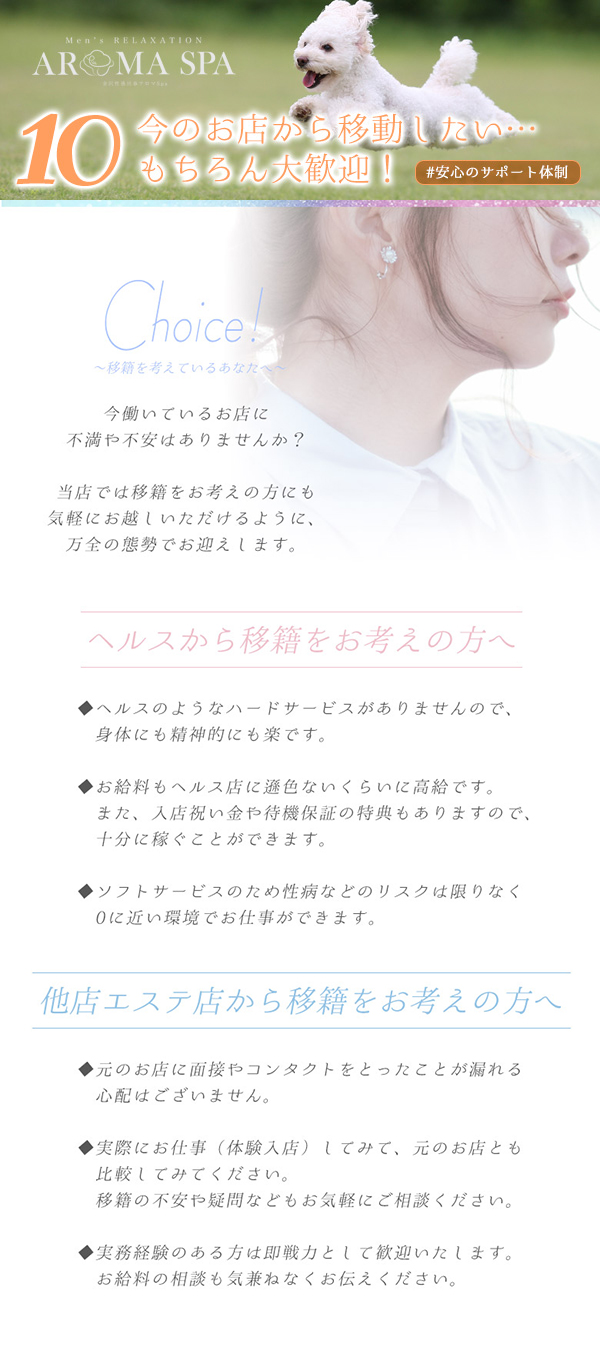 当店のHPをご覧頂きありがとうございます。当店は風俗でありながらに「舐めない、脱がない、触られない」のサービスで、ヘルス店のフ●ラや、ソープ店の本●行為のようなハードプレイは一切しないソフトプレイのお店です。性病にリスクも無く、身体を酷使することもありません。無理せずとも高収入を得ることが出来ます。未経験の子は「エステ」と聞くと難しそうと思われがちですが、当店では常駐の女性講師がマニュアルに沿って指導しますので誰でも簡単にお仕事を始めることが出来ます。迷っている方は電話やメールだけでも構いません。スタッフ一同あなたの一歩をお待ちしております。