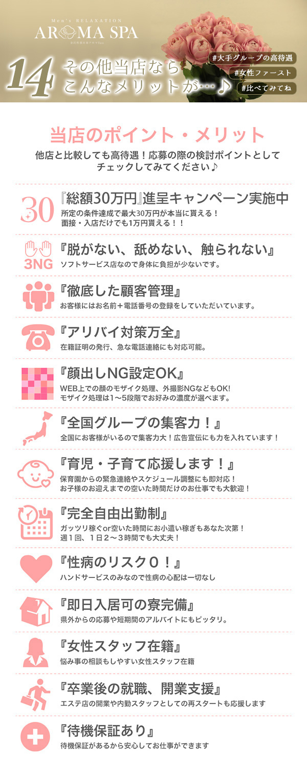 当店のHPをご覧頂きありがとうございます。当店は風俗でありながらに「舐めない、脱がない、触られない」のサービスで、ヘルス店のフ●ラや、ソープ店の本●行為のようなハードプレイは一切しないソフトプレイのお店です。性病にリスクも無く、身体を酷使することもありません。無理せずとも高収入を得ることが出来ます。未経験の子は「エステ」と聞くと難しそうと思われがちですが、当店では常駐の女性講師がマニュアルに沿って指導しますので誰でも簡単にお仕事を始めることが出来ます。迷っている方は電話やメールだけでも構いません。スタッフ一同あなたの一歩をお待ちしております。