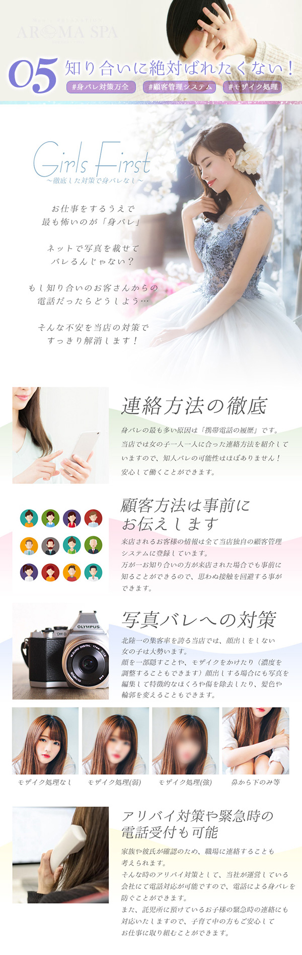 当店のHPをご覧頂きありがとうございます。当店は風俗でありながらに「舐めない、脱がない、触られない」のサービスで、ヘルス店のフ●ラや、ソープ店の本●行為のようなハードプレイは一切しないソフトプレイのお店です。性病にリスクも無く、身体を酷使することもありません。無理せずとも高収入を得ることが出来ます。未経験の子は「エステ」と聞くと難しそうと思われがちですが、当店では常駐の女性講師がマニュアルに沿って指導しますので誰でも簡単にお仕事を始めることが出来ます。迷っている方は電話やメールだけでも構いません。スタッフ一同あなたの一歩をお待ちしております。