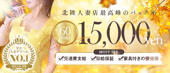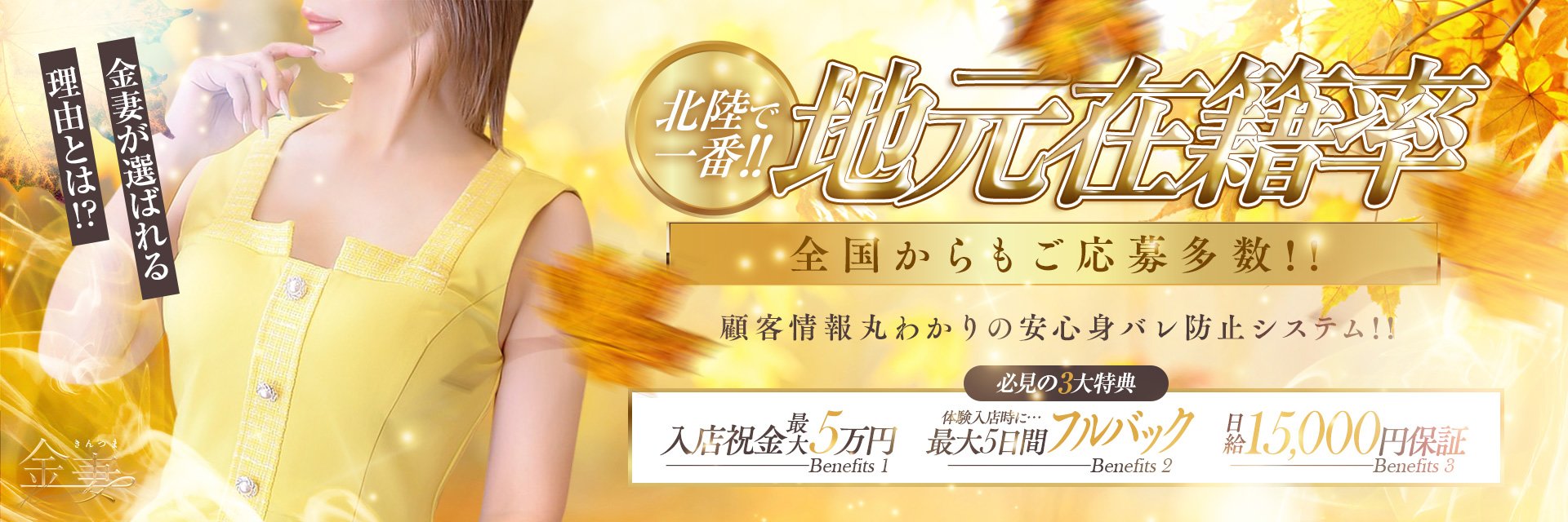 【地元・北陸の女性大募集】絶対に北陸で一番他店より稼げる【北陸人妻随一】20代30代の女性さらには40代50代の奥様も☆どんどん稼いでます☆●15年連続入客数(案内数)エリアNo.1 ●流行ってる?忙しい?の最大のバロメーター、ヘブンネットランキングはお店も女の子も連続“第1位”記録更新中!! ●金妻に在籍する女性はもの凄く稼いでるのは【有名】です ●90分×3=45000円+α ※6時間待機(出勤)で稼げます ●日給10万円も可能!15万円も当グループなら稼げます! ●月収100万円以上の達成者もいます!! ●【日給8万円以上】…平日でも頻繁に達成してます