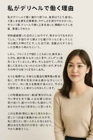 デリヘルで働く理由は、今では単なる経済的な目的だけではなくなりました。自分の夢を叶えるため、家族に恩返しするため、そして何よりも「今の自分をもっと好きになるため」に、この仕事を続けています。通帳にお金が貯まっていくたび、少しずつ未来が明るくなるような気がして、また頑張ろうと思えます。