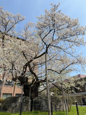 春になると、地元の人々や観光客が訪れ、満開の桜と岩のコントラストを楽しみます。背景に近代的な建物があることで、歴史と現代が交差する独特の景観が生まれています。