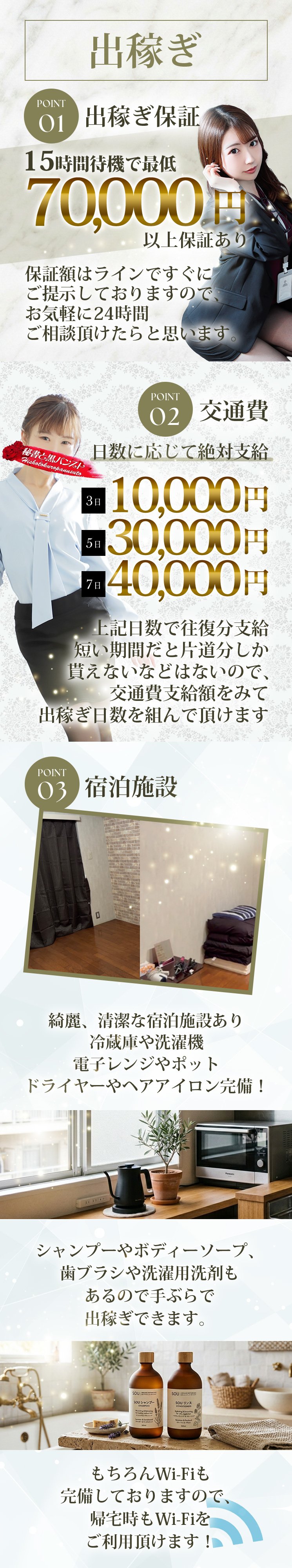 | A | 本来お給料はお客様がお選び頂くお時間でのコースに対し、お給料が発生します。 お客様が来なかった場合、お給料は発生しないのですが、そのお給料の保証をさせて頂いております。 秘書と黒パンスト高松店では 5時間待機 25,000円 12時間待機 55,000円 15時間待機 70,000円 こちら保証しておりますので、お給料に不安がある方はぜひお問い合わせください。 |
