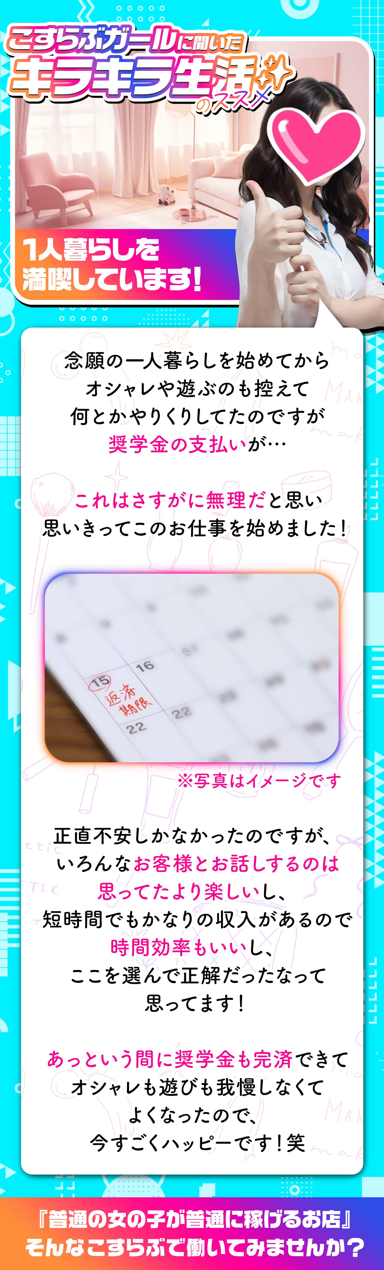 『本当の話をします。』出稼ぎリピ率ほぼ100%なのです^^お給料・待機環境・スタッフ信用度、すべて高水準だからこそ何度も行きたくなるお店なのです♪貴女を全力でサポートいたしますので、全力で稼いでお帰りください♪出稼ぎ先をお探しで困っている女の子は、当店『こすらぶ鹿児島店』へぜひ!お越しください♪♪♪