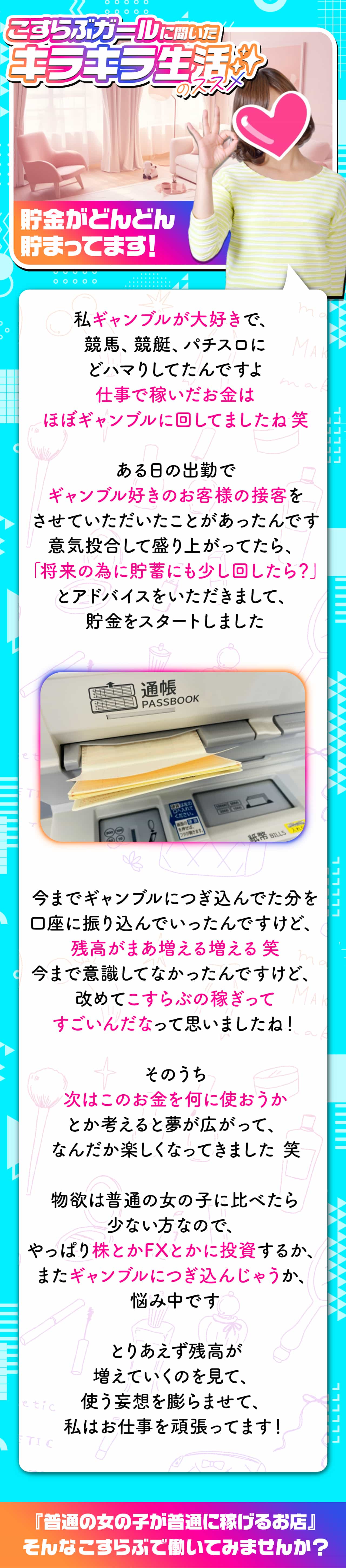 『本当の話をします。』出稼ぎリピ率ほぼ100%なのです^^お給料・待機環境・スタッフ信用度、すべて高水準だからこそ何度も行きたくなるお店なのです♪貴女を全力でサポートいたしますので、全力で稼いでお帰りください♪出稼ぎ先をお探しで困っている女の子は、当店『こすらぶ鹿児島店』へぜひ!お越しください♪♪♪