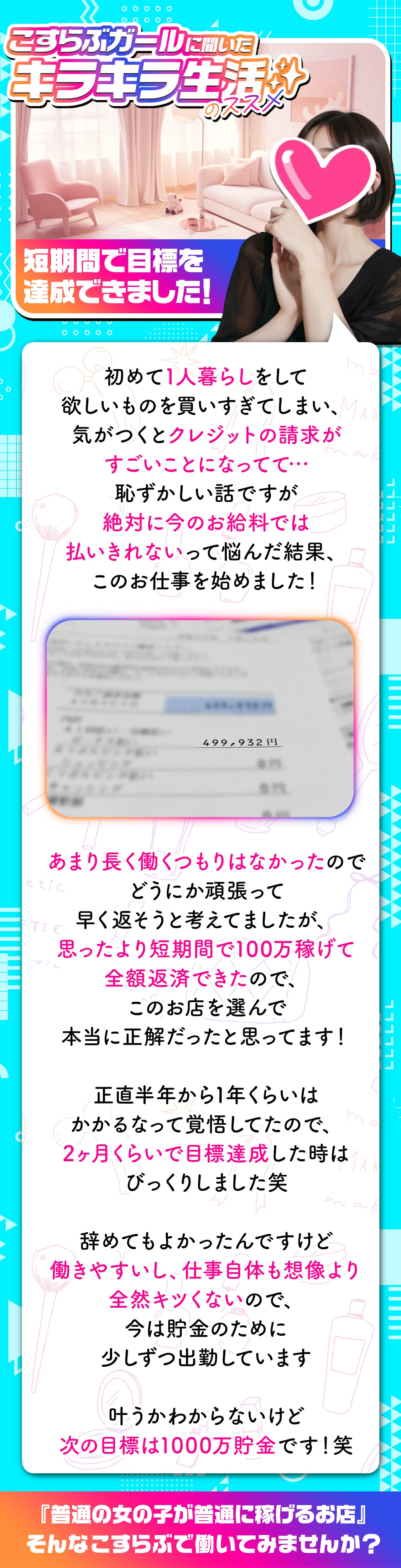 『本当の話をします。』出稼ぎリピ率ほぼ100%なのです^^お給料・待機環境・スタッフ信用度、すべて高水準だからこそ何度も行きたくなるお店なのです♪貴女を全力でサポートいたしますので、全力で稼いでお帰りください♪出稼ぎ先をお探しで困っている女の子は、当店『こすらぶ鹿児島店』へぜひ!お越しください♪♪♪