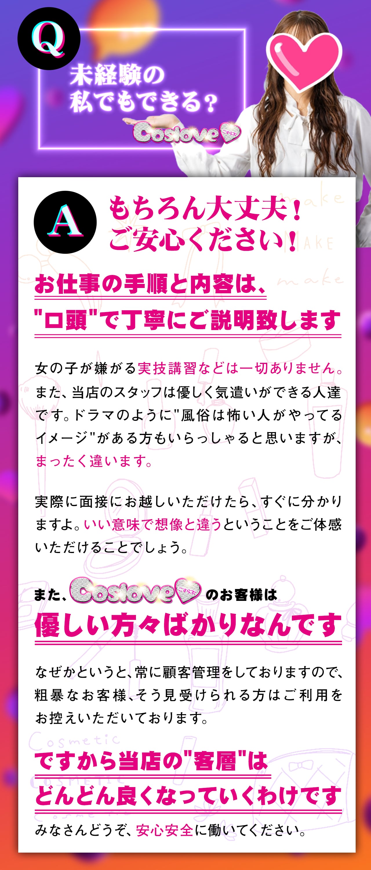 『本当の話をします。』出稼ぎリピ率ほぼ100%なのです^^お給料・待機環境・スタッフ信用度、すべて高水準だからこそ何度も行きたくなるお店なのです♪貴女を全力でサポートいたしますので、全力で稼いでお帰りください♪出稼ぎ先をお探しで困っている女の子は、当店『こすらぶ鹿児島店』へぜひ!お越しください♪♪♪