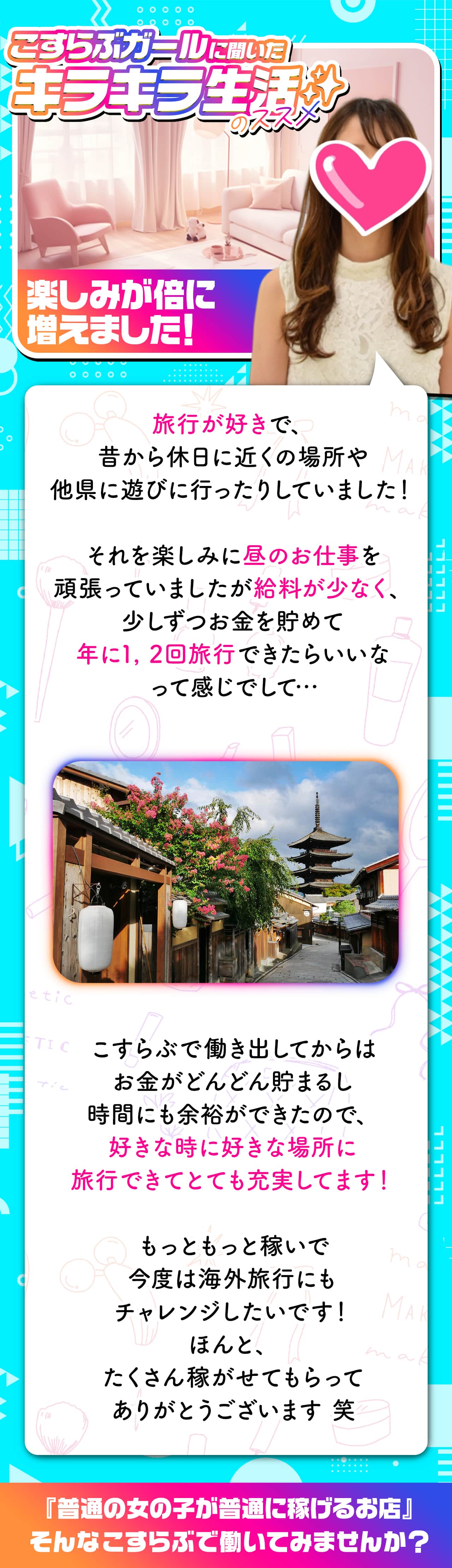 『本当の話をします。』出稼ぎリピ率ほぼ100%なのです^^お給料・待機環境・スタッフ信用度、すべて高水準だからこそ何度も行きたくなるお店なのです♪貴女を全力でサポートいたしますので、全力で稼いでお帰りください♪出稼ぎ先をお探しで困っている女の子は、当店『こすらぶ鹿児島店』へぜひ!お越しください♪♪♪