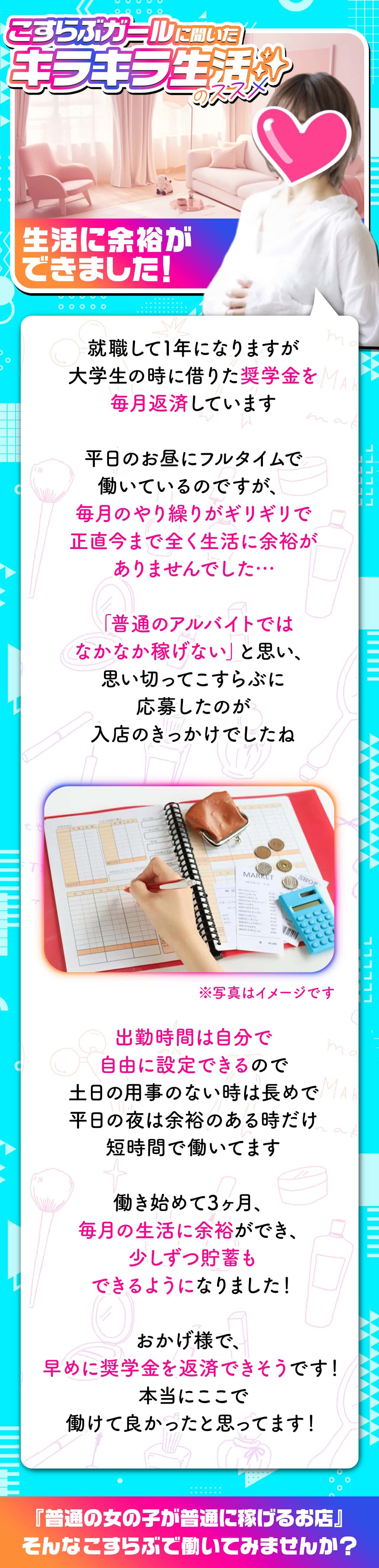『本当の話をします。』出稼ぎリピ率ほぼ100%なのです^^お給料・待機環境・スタッフ信用度、すべて高水準だからこそ何度も行きたくなるお店なのです♪貴女を全力でサポートいたしますので、全力で稼いでお帰りください♪出稼ぎ先をお探しで困っている女の子は、当店『こすらぶ鹿児島店』へぜひ!お越しください♪♪♪