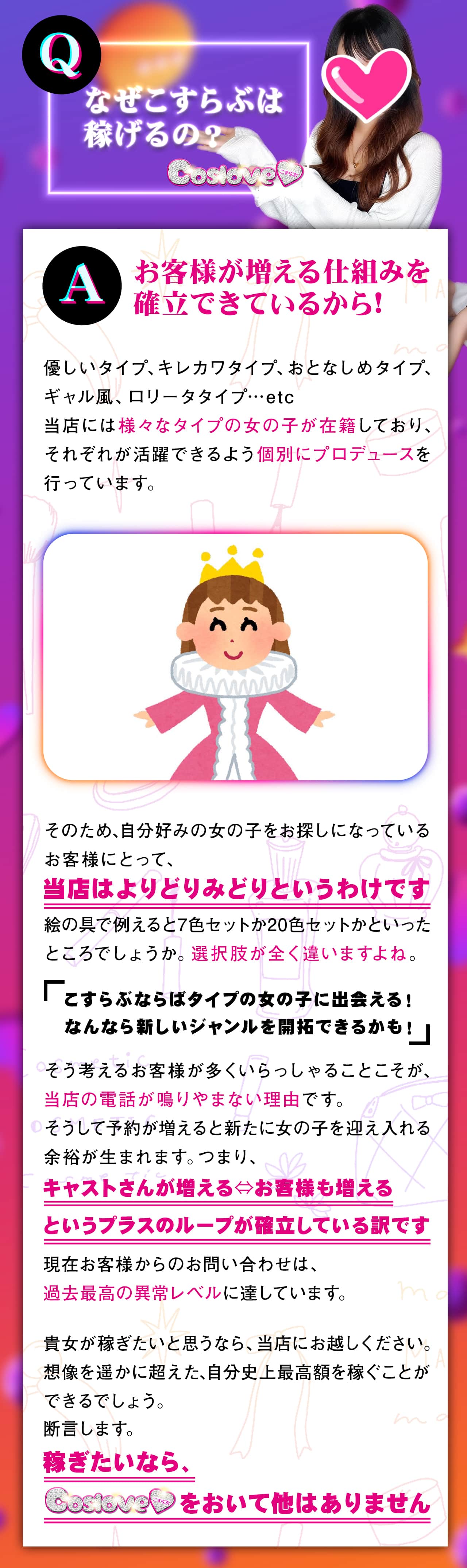 『本当の話をします。』出稼ぎリピ率ほぼ100%なのです^^お給料・待機環境・スタッフ信用度、すべて高水準だからこそ何度も行きたくなるお店なのです♪貴女を全力でサポートいたしますので、全力で稼いでお帰りください♪出稼ぎ先をお探しで困っている女の子は、当店『こすらぶ鹿児島店』へぜひ!お越しください♪♪♪