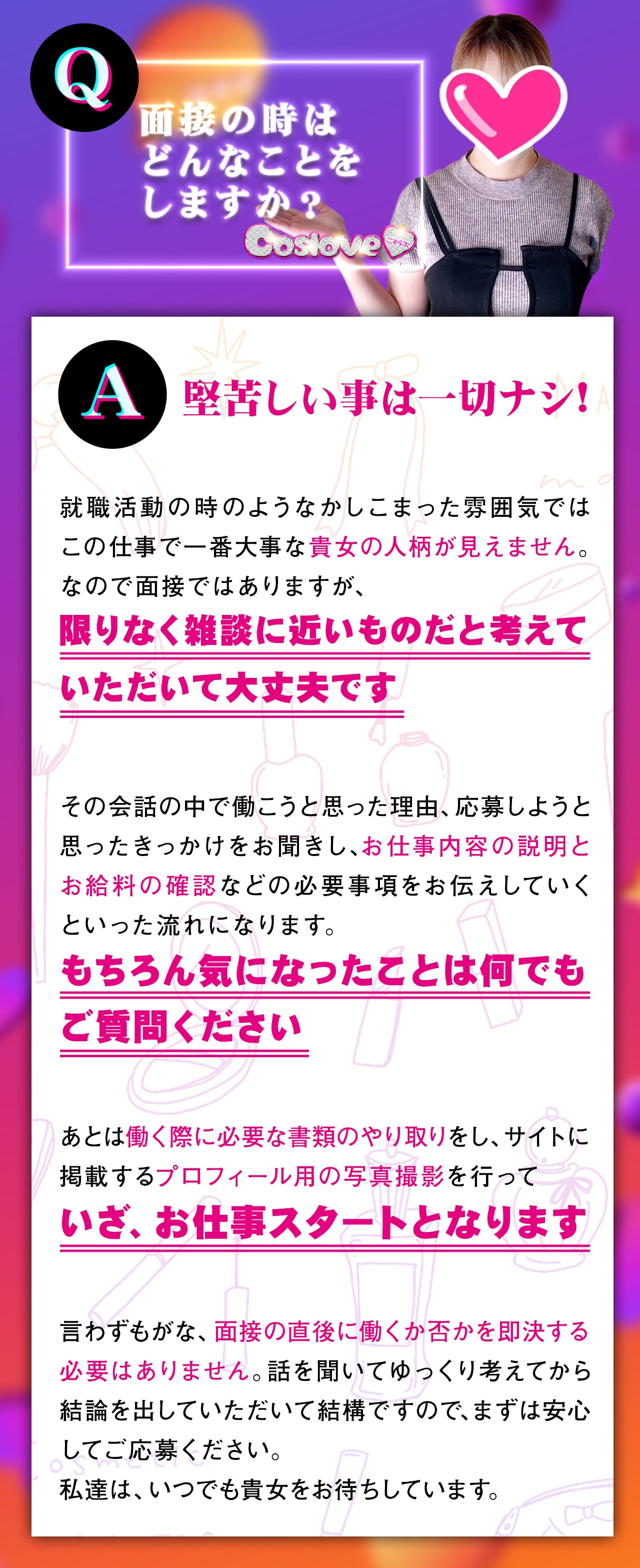 当店は未経験から始める子がメインです♪丁寧なバックアップと確実なお給料で、周りにバレないように「ヒミツのアルバイト」として話題沸騰中!自由出勤、個室待機OK、まずは気軽にLINEで***を友達追加しちゃおう♪