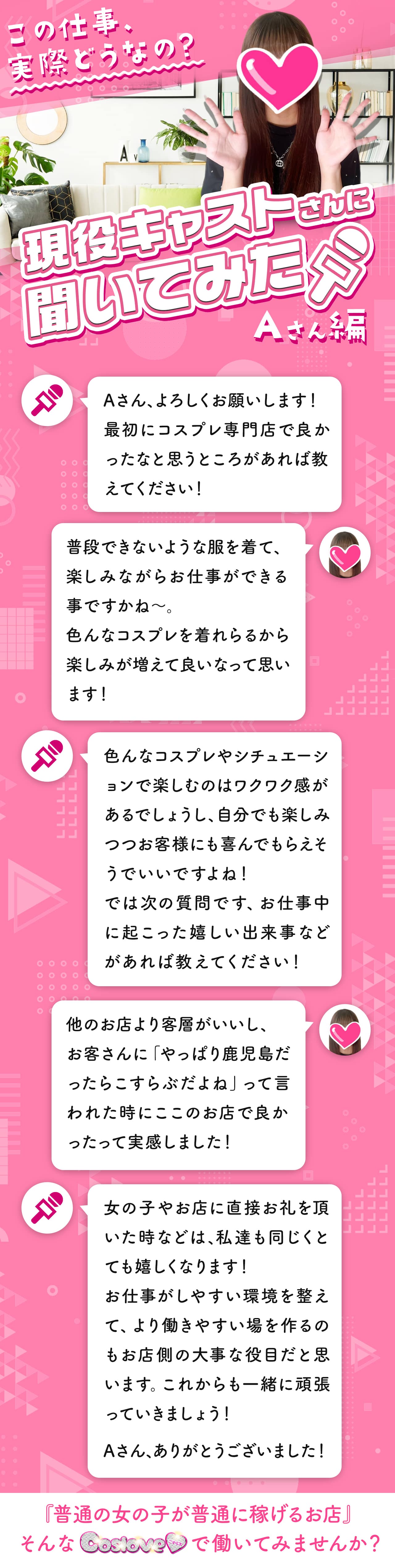 『本当の話をします。』出稼ぎリピ率ほぼ100%なのです^^お給料・待機環境・スタッフ信用度、すべて高水準だからこそ何度も行きたくなるお店なのです♪貴女を全力でサポートいたしますので、全力で稼いでお帰りください♪出稼ぎ先をお探しで困っている女の子は、当店『こすらぶ鹿児島店』へぜひ!お越しください♪♪♪