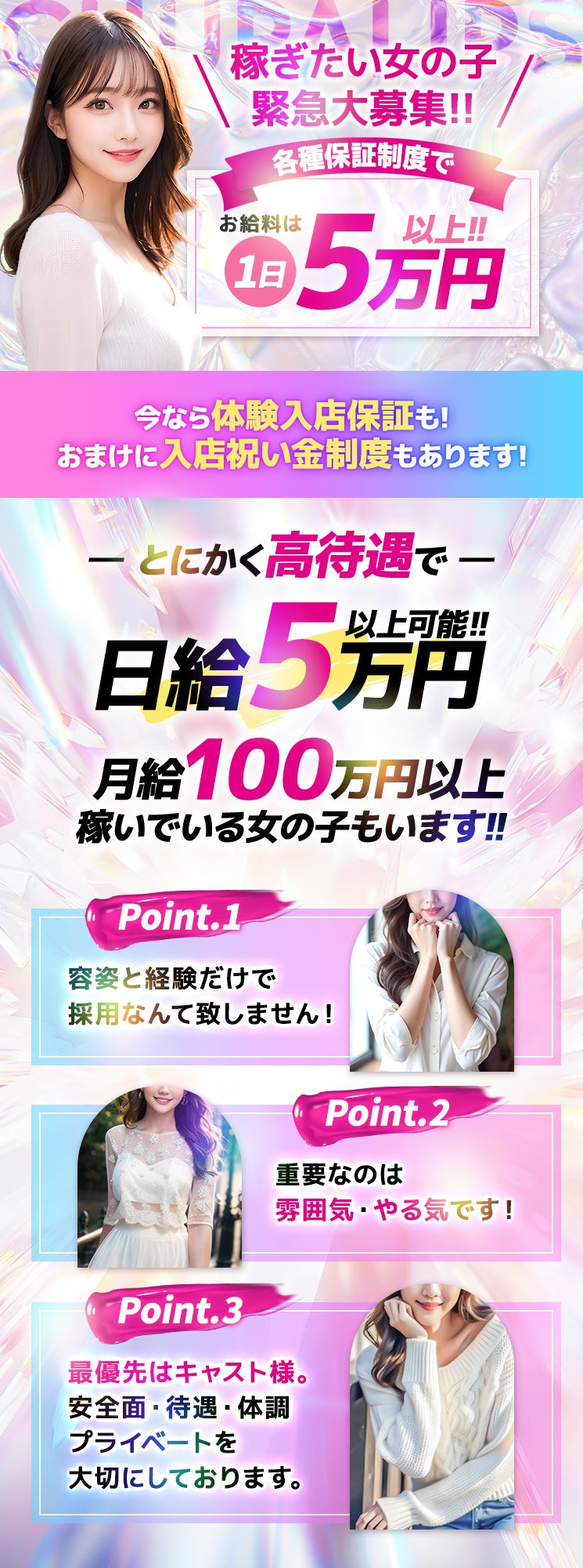 容姿だけ、経験だけのようなご採用は致しません。キャスト様の雰囲気、やる気などでご採用させて頂きます。なので、容姿に自信がない、未経験全然OKです!むしろ大歓迎させて頂きます。