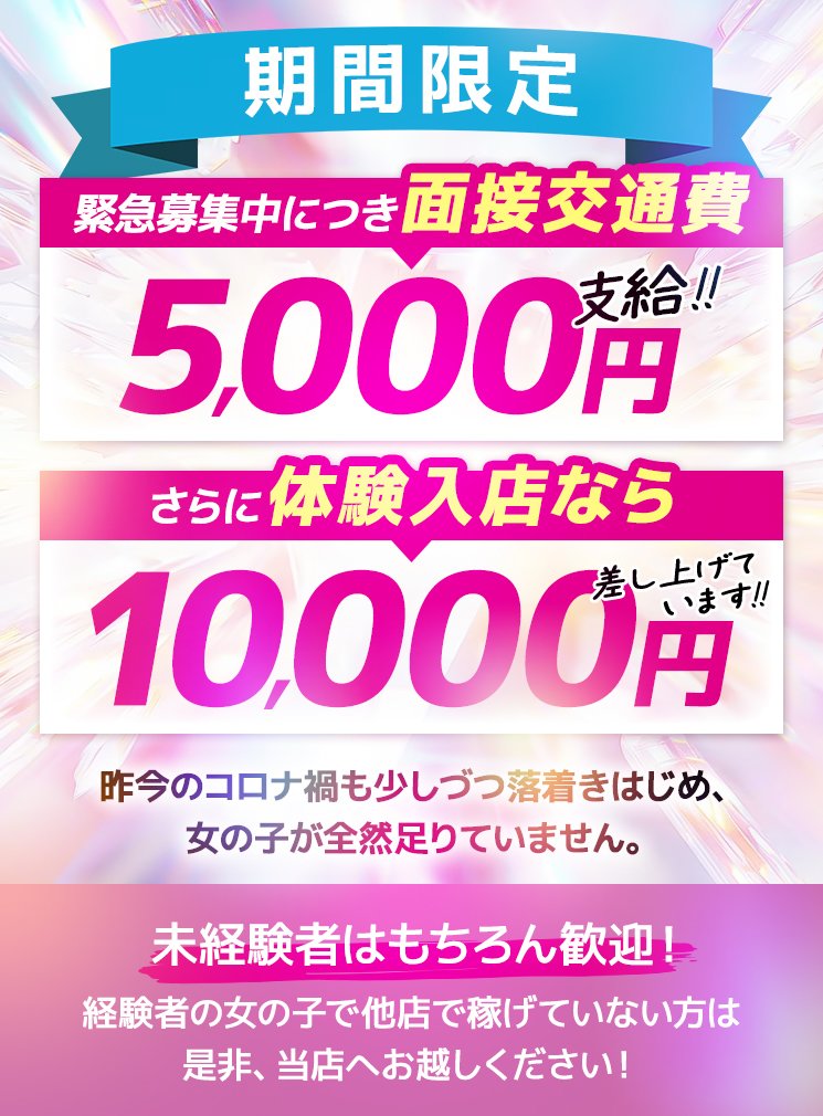 緊急募集中につき、面接交通費5000円、さらに体験入店なら10000円を差し上げています!!