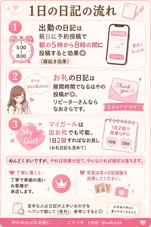 ① 出勤の日記は前日に予約投稿で朝の5時から8時の間に投稿すると効果◎(寝起き効果)