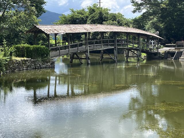 その池にそっと架かるのが、風情たっぷりの屋根付き橋『太鼓橋』です。