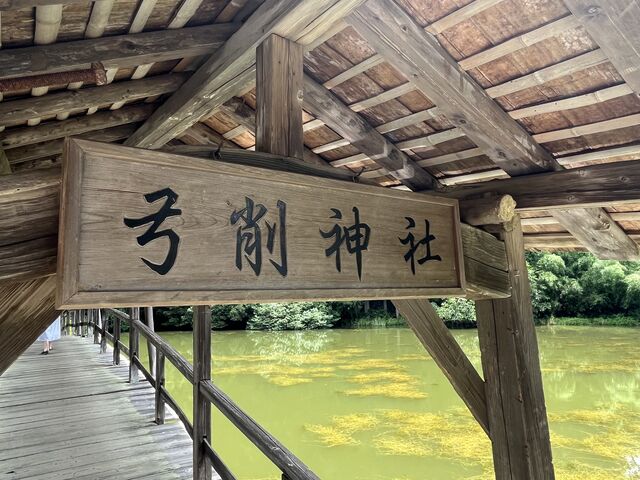 弓削神社の社殿を囲むように広がる「弓削池」。