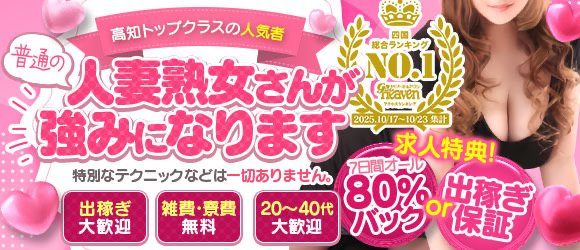 【求人特典実施中】人妻熟女専門店の最高峰『高知デリヘル倶楽部』は幅広い年齢の女性に支持されており、安心・正直・親切をモットーに安心して働けるお店です! 地域TOPクラスのお客様数の多さが売りで「お給料80%バック」「出稼ぎ保証」「待機保証」などの入店特典も用意してます。 主婦の方が多く1回の出勤時間が短い方が多いですが、それでも1日3~4万円稼ぐ女性がほとんどです。『風俗業界は初めて…』『容姿やスタイルに自信が無い…』『いっぱい稼ぎたい…』そんな貴女を当店は誠心誠意応援致します!地元高知にお住まいの方だけでなく、県外からの出稼ぎの方も大歓迎です。