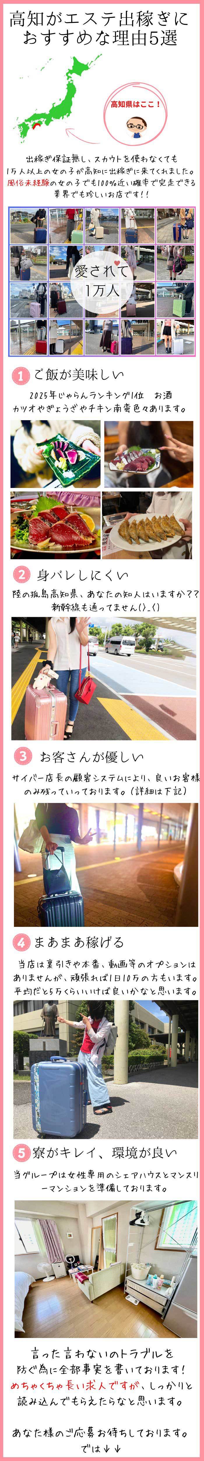 脱がない、舐めない、触らせない!お給料は高知で1番高いお給料、完全個室待機、高知県外の方も大募集!日本でも数少ない出稼ぎエステも対応しております!高知県は風俗系のエステはたったの3店舗なので、意外と稼げるんです!