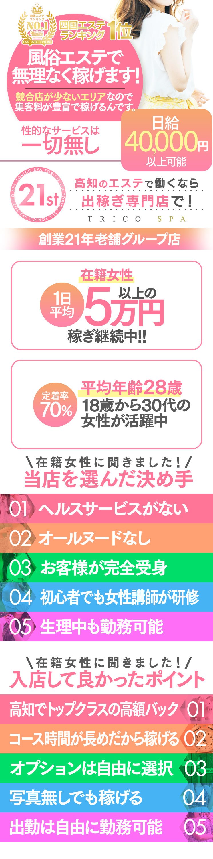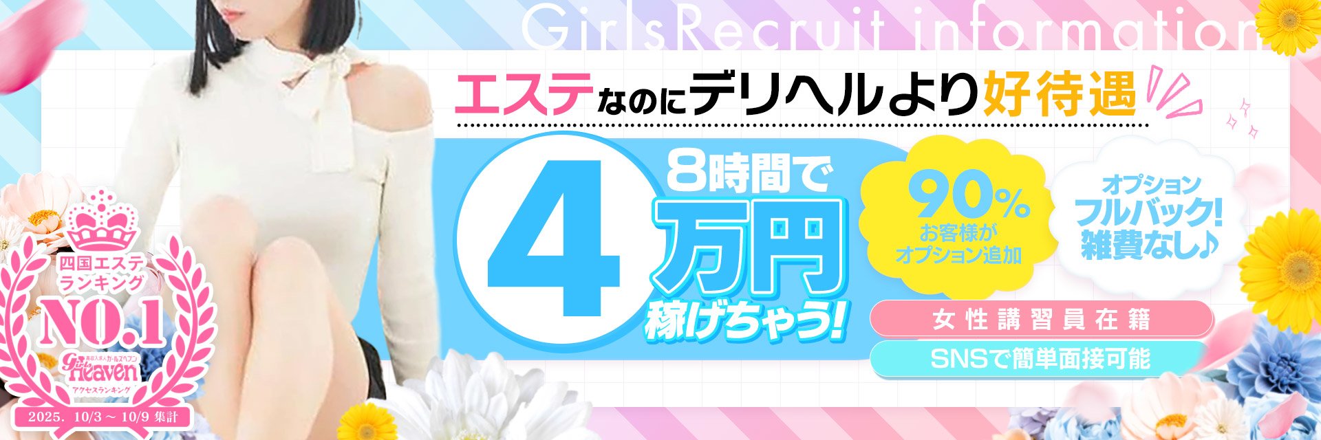 《出稼ぎ特典有》性病感染リスク「ゼロ」、粘膜同士の接触「ゼロ」という安心・安全を第一に考えた、高知で唯一のリラクゼーションスパです。健全なマッサージに、大人の癒しと少し刺激的な要素をプラスした、新感覚のリラクゼーションをご提供しております。従来の風俗店とは一線を画すサービス内容のため、清潔で落ち着いた空間の中で、安心して高収入を目指せる環境を整えております。未経験の方でも、安心してお仕事を始めていただけます。