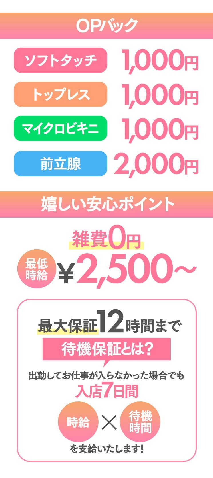 ▼この店を選んだきっかけは?新店でオープンしたばかりでお給料が良かったのと自分の好きな時間に出勤して働けるので助かっています。デビュー後はどの時間でも優しいお客様にお越し頂けるので安心して働けています!~出勤時間~11:00~18:00▼お給料①90分コース+OP+本指名⇒¥15,900②240分コース+OP+本指名⇒¥35,900③60分コース+OP+本指名⇒¥11.700合計¥63,500円※雑費無し▼平均の稼ぎは?入店してから待機する事なくお仕事させてもらっています!新人ですが3.4万円のお給料は安定して頂けています