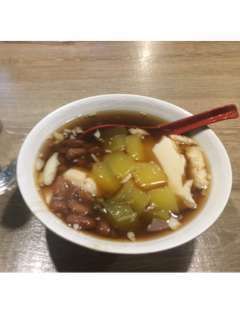 暖かいお汁粉みたいな甘いスープに豆腐とマンゴーと豆が入ったスィーツです!