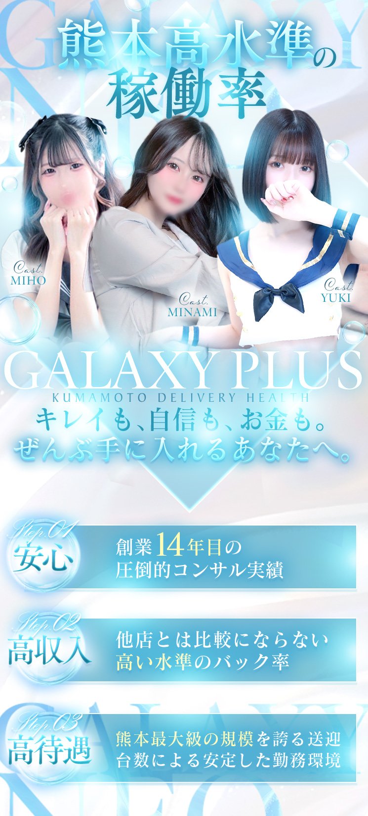あたしは前のお店での待遇が嫌になってこのお店に入りました。普段は他のお仕事をしていて、あまりたくさん出勤できないけどお店の人はちゃんと考えてくれるし、すごく助かります(^^)たくさん稼いで早く自分のお店を持てるようになって、ギャラクシーのみんなに恩返ししたいです♪
