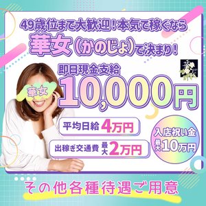 これは『大人の女性』を募集するお店様が多数ある中、30代40代の女性達があえて『華女(かのじょ)』を選ぶ理由として、上記でご紹介させて頂いた『グループ内で実証されている人気があり知名度のある店名』や『お給料が高額設定されている』『在籍写真を希望通り加工を行う』『安心価格で定期性病検査が出来る』等、これら環境や条件にシビアな大人の女性達に『どのお店様よりも自然に働ける居心地の良いお店』として認知されているからだと思われます。