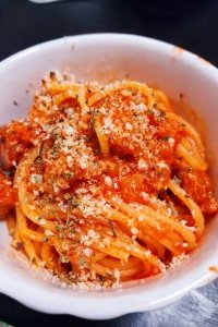 見てください、この雪のような粉チーズの山を!❄️🧀 熱々のパスタの上でとろりと溶ける瞬間がたまらない…! チーズの塩気とトマトの甘みが最高の相性なんです。