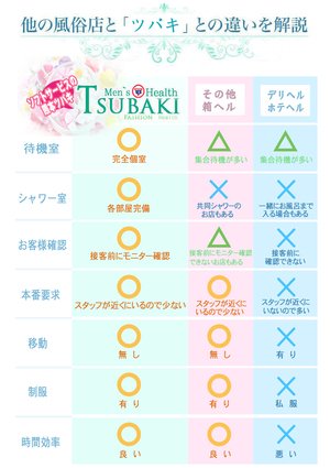 ツバキでは、女の子が稼げて安心して気持ち良く働けることを第一に考えています。女の子の働く環境が整っている事が良いお仕事ができ、多くのお客様にご来店して頂けると思うからです。ですので、女の子の意見や要望は最大限に尊重いたします。また、働きやすい環境を作るにはスタッフの体制が整っている事も必要だと考えております。当店は正社員の3年以上のキャリアがあるベテランスタッフのみで営業しております。