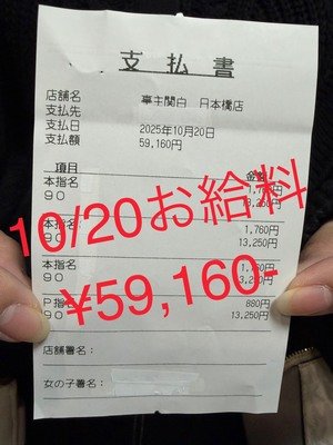 🌸【10月20日勤務】59,160円のお給料✨こんにちは!マネージャーのひらさわです😊本日もキャストさんのお給料をご紹介します!10-16の...