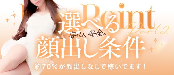 | A | 当店の身バレ対策はバッチリです!選べる顔出し条件で、顔出し/目出し/モザイク/口元カットなどをご自身で選んでいただけます! もちろん顔出し条件で稼ぎが大きく変動することはございません! また、WEB専門部署でプロが加工修正をしますのでご安心くださいませ! |