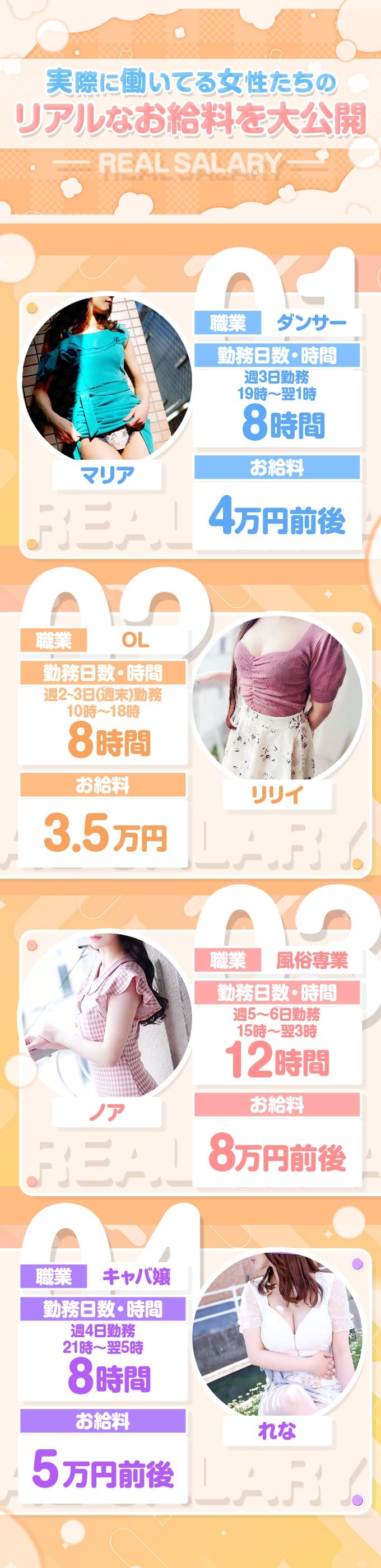 A | はい、お給料の保証は本当に出ます!! ご指摘の通り、保証額は出勤時間によって変動しますが、売上に関わらず最低限お支払いすることをお約束する制度です♪ 保証制度の詳細は面接でしっかりご説明しますので、ご安心ください!! |