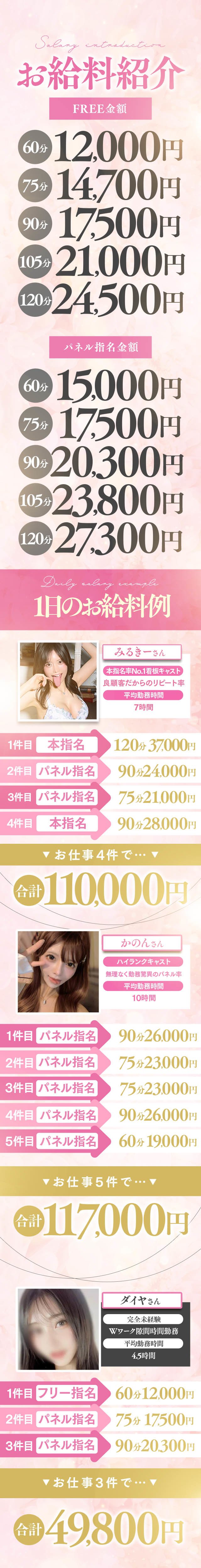 60分💎パネル指名だと15,000円~上限なし💎(看板級の女性特に優遇♪)