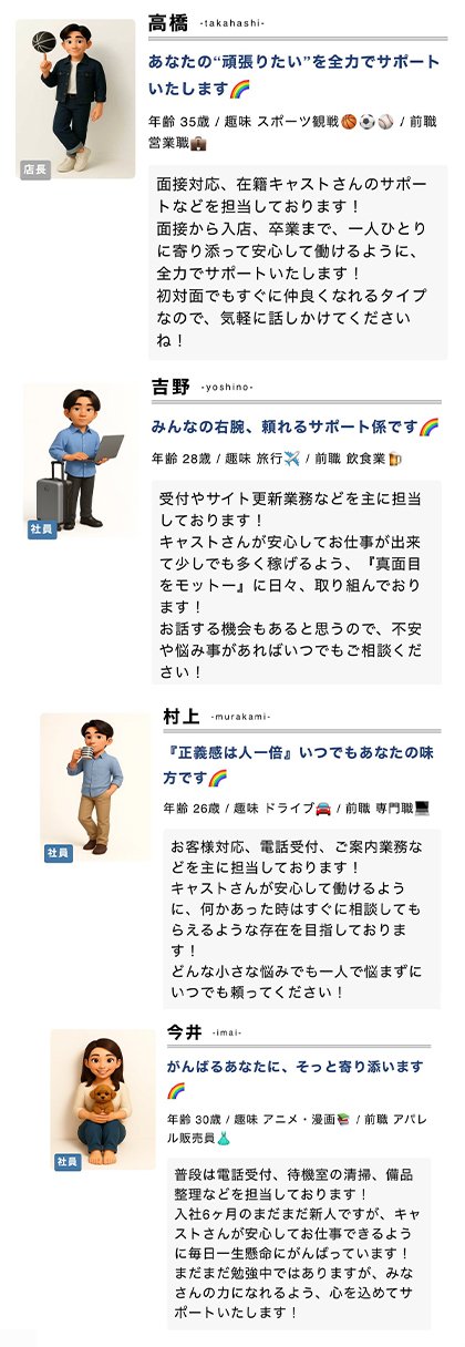 | A | 【ぽっちゃり体型】や【コンプレックス】など💭 容姿に悩みをを感じている方もご安心ください! 当店では、【人柄ややる気】を最も大切にしています! 年齢や容姿、タトゥーなどで不採用になることはありません! また、【女性スタッフ】も在籍しているので、 男性には言いづらいことでも気軽にお話しくださいね! |