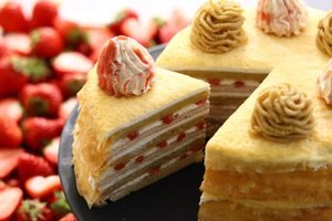 取り分けた時、薄焼きのクレープ生地と4色のクリームが重なった美しい層をお楽しみください。
