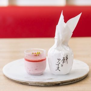 京都・京はやしや【餅とアイス 苺】とろーりとろける新食感のとろーりもちと頂く、京はやしやの特製アイス。