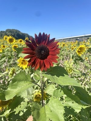 黄色いひまわりの中にぽつんといたこの赤いひまわり(メキシコヒマワリ)が